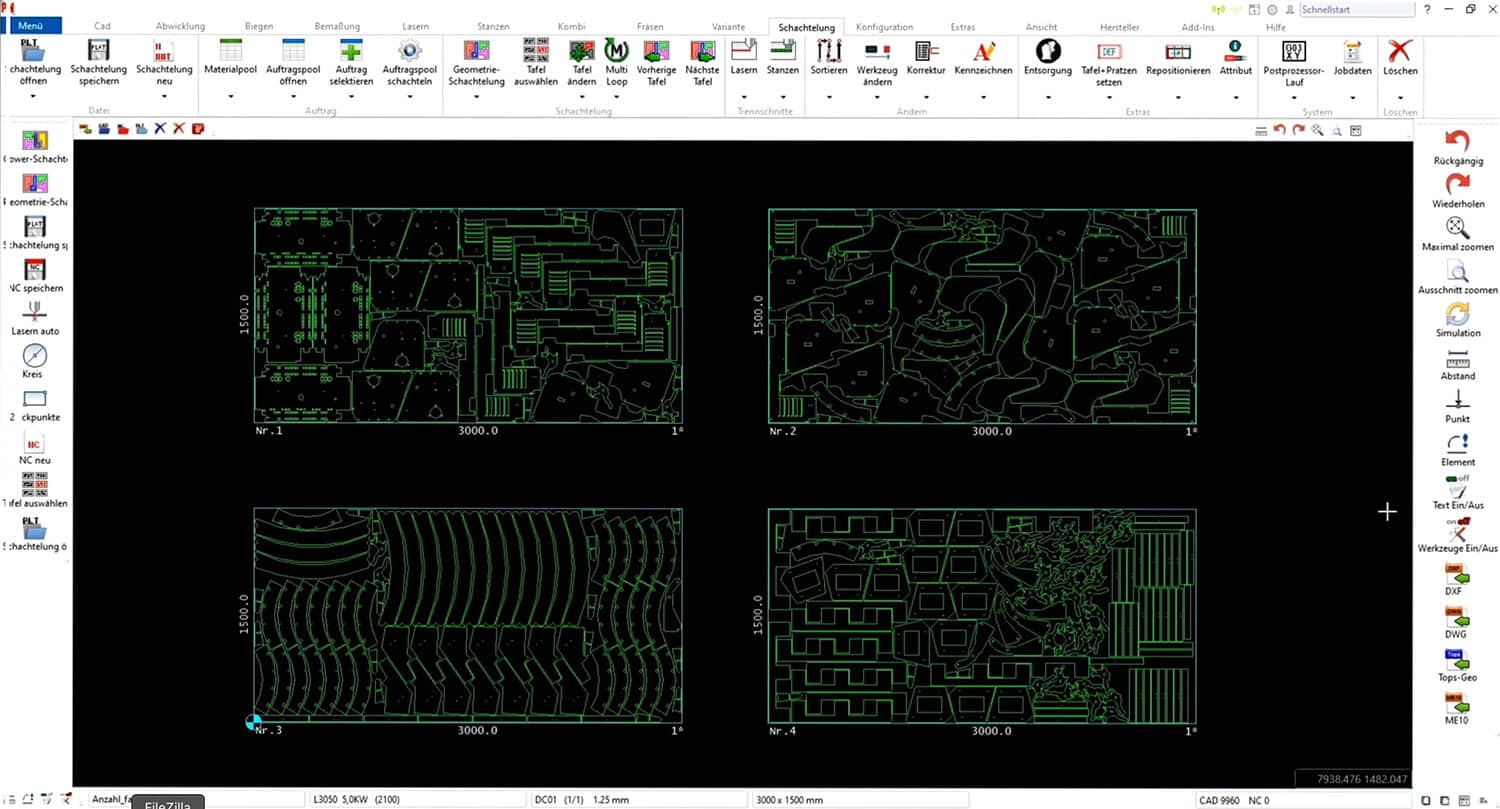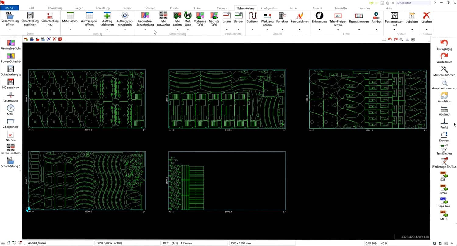 Schachteln puzzelt Ihre Teile automatisch mit bester Materialausnutzung und höchster Prozess-Sicherheit. Gemeinsame Trennschnitte für Stanz- und Laserbearbeitung und kombinierte Bearbeitung erhöhen den Nutzungsgrad und senken die Fertigungszeit. Mit der integrierten Materialverwaltung erfassen Sie Bestände und Verbräuche sowie materialbezogene Informationen, zum Beispiel Chargen und Lagerplätze.